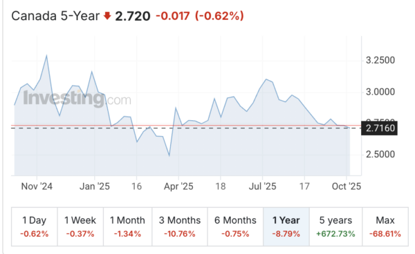 Currently, as of October 14, 2025, as seen in the Yield chart below, the Canadian Bonds are pricing in: